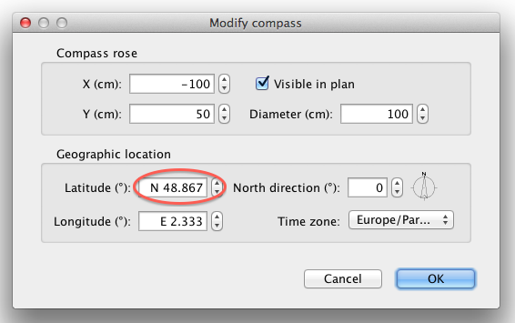 Once you’ve obtained a result that pleases you, you can choose the highest quality level and a larger resolution. Keep in mind that changing the date will probably give a different result, according to your geographic location. If needed, you may adjust your latitude and longitude with the dialog box shown by the Plan > Modify compass menu item.